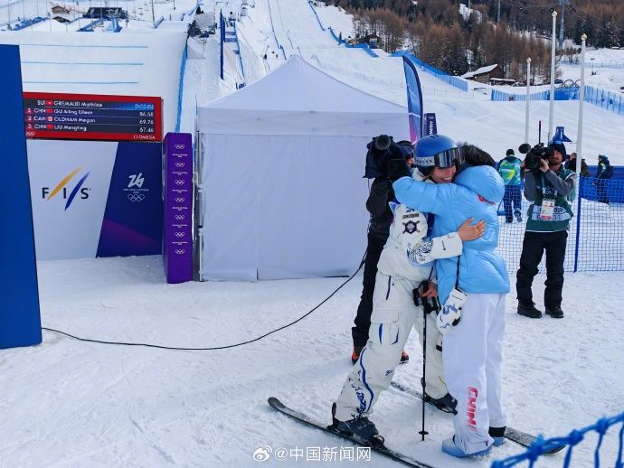 2月9日,米兰-科尔蒂纳冬奥会自由式滑雪女子坡面障碍技巧决赛,中国选手谷爱凌第一滑结束后和母亲相拥。中国新闻网 朱晨曦 摄