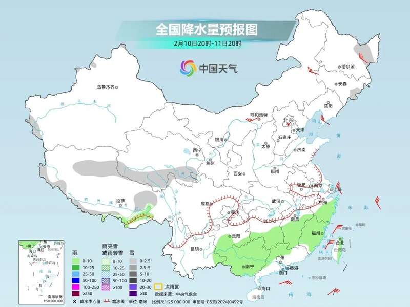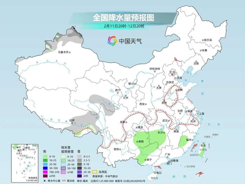 今明天,我国降水总体呈现减弱趋势,南方降水进一步收缩到贵州、湖南、广西一带。