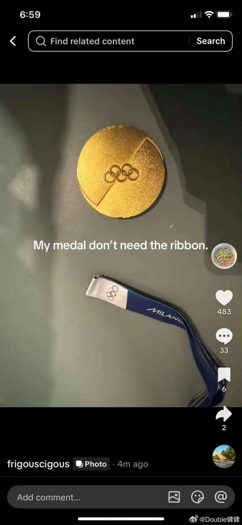 2月9日的花样滑冰团体赛,凭借伊利亚·马里宁在男单自由滑的关键表现,美国队成功蝉联金牌。然而女单运动员艾丽萨·刘在赛后不久,便在社交媒体发布视频,展示了她的团体金牌,已从官方丝带上脱落。她无奈配文“我的奖牌不需要丝带”。此前,据美国高山滑雪女子速降金牌得主布里齐·约翰逊透露,她在夺冠后兴奋跳跃庆祝时,胸前奖牌从挂绳连接部位断裂,摔成三截。她哭笑不得地提醒其他选手“请轻拿轻放”。