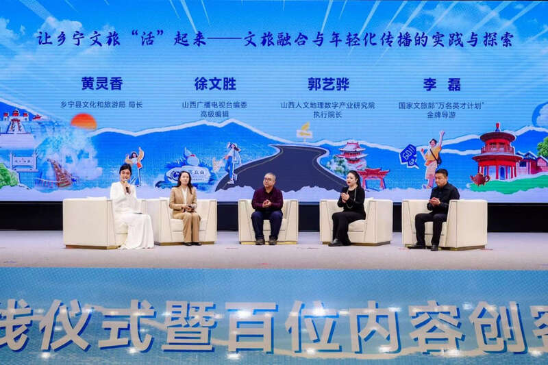 活动期间举办了圆桌沙龙,乡宁县文旅局局长黄灵香,山西广播电视台编委、高级编辑徐文胜,山西人文地理数字产业研究院执行院长郭艺骅以及国家文旅部“万名英才计划”金牌导游李磊围绕“年轻化视角下的文旅传播”“乡宁文旅资源的创意转化”“创客与县域文旅的双向赋能”等话题展开深入交流。大家从不同角度分享了自己的观点,用年轻化跨界融合重构乡宁文旅边界;乡宁县文旅局局长黄灵香详细解读了乡宁的自然人文之美、文旅发展成效及此次《乡宁巡游记》上线和创客探索行动的意义与规划,为创客们提供方向指引。对话间隙,乡宁本地歌手登台演唱歌曲《烙油馍》,用悠扬旋律展现乡宁饮食文化魅力,为活动增添浓厚民俗氛围。