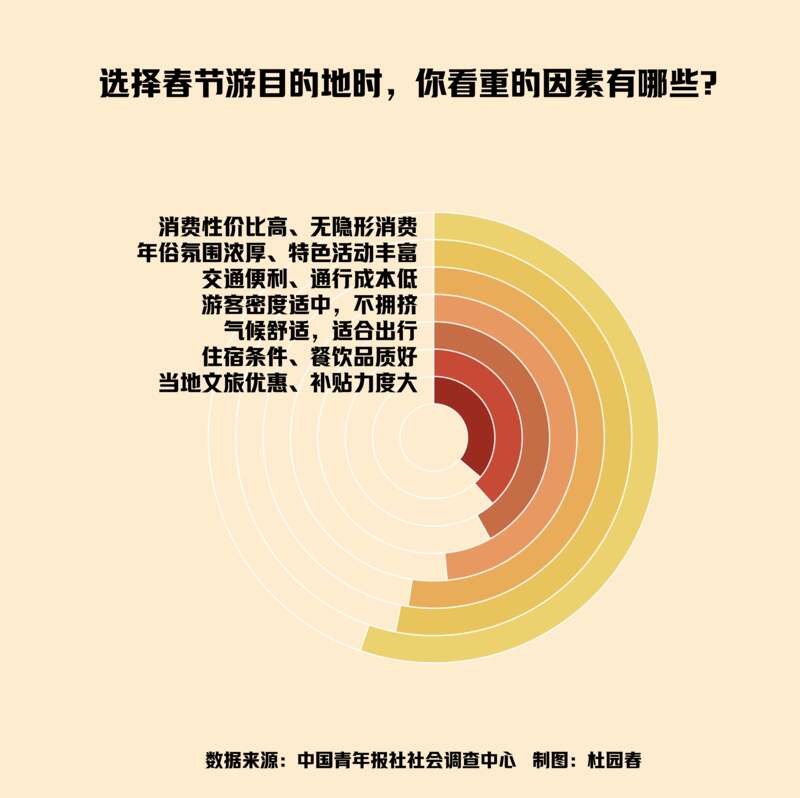 日前,中国青年报社社会调查中心联合问卷网(wenjuan.com),对1000名受访者进行的一项调查显示,选择“春节游”目的地时,消费性价比高、无隐形消费(55.3%),年俗氛围浓厚、特色活动丰富(53.1%),交通便利、通勤成本低(52.4%)是受访者最看重的几个因素。