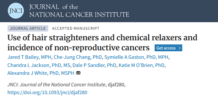 2025年9月,一篇发表在《美国国家癌症研究所杂志》上的研究显示,使用直发剂/化学烫发剂可能会大幅增加多种癌症风险。与未使用者相比,使用者与甲状腺癌、非霍奇金淋巴瘤和胰腺癌的发病风险分别增加71%、62%、166%相关。