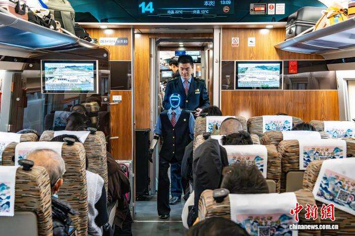 2月10日,“编外”乘务员“福兴”机器人登上列车,开启新一天的“上班日”。今年春运期间,“福兴”机器人亮相铁路杭州客运段“西子号”列车,为旅客提供列车信息咨询、互动问答等服务。图为“福兴”机器人亮相高铁车厢。中新社记者 吴君毅 摄