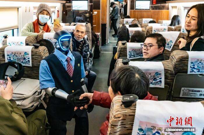 2月10日,“编外”乘务员“福兴”机器人登上列车,开启新一天的“上班日”。今年春运期间,“福兴”机器人亮相铁路杭州客运段“西子号”列车,为旅客提供列车信息咨询、互动问答等服务。图为旅客与“福兴”机器人互动。中新社记者 吴君毅 摄