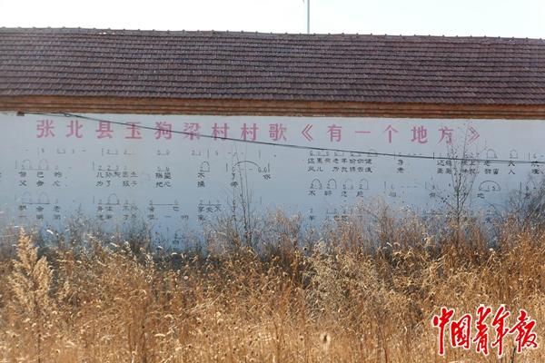 玉狗梁村委会墙上印刷着村歌。实习生 马思洋/摄