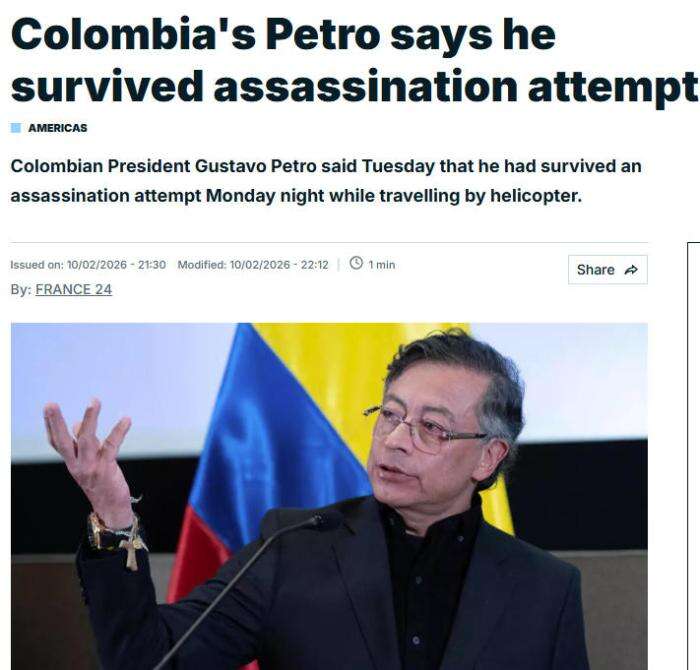 中新网2月11日电 据法兰西24电视台报道,当地时间10日,哥伦比亚总统佩特罗表示,他数小时前逃脱了一起暗杀企图。