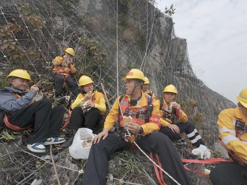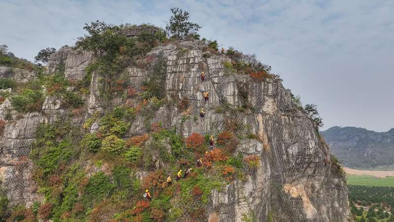 一个半小时后,“爬山虎”突击队抵达崇左市的一个作业区,四周全是陡峭的石山。队员们从车上卸下装备,开始穿戴安全绳和安全帽。“主要任务是检查既有的主动网、被动网是否有松动、脱落、锈蚀,或者有包裹不到位的危石”,杨发登和队员们要严格按照要求在天窗期内,也就是没有火车通过的时候作业,施工时间有限。