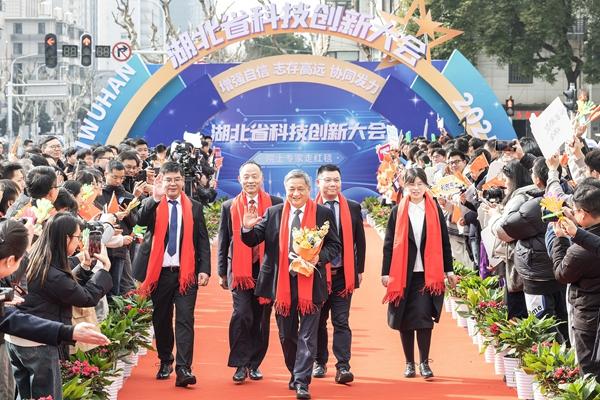 2025年1月6日,湖北省科技创新大会在武汉洪山礼堂举行,武汉大学夏军院士和华中科技大学李培根院士获科学技术突出贡献奖。图为长江设计集团首席科学家、中国工程院院士钮新强和团队走红毯进入会场。视觉中国供图(资料图片)