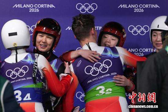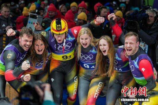 当地时间2月12日晚,2026年米兰-科尔蒂纳冬奥会雪橇团体接力赛在科尔蒂纳滑行中心举行。德国队以3分41秒672的成绩打破赛道纪录夺得金牌,并实现在冬奥会该项目上的四连冠。图为德国队在赛后合影。