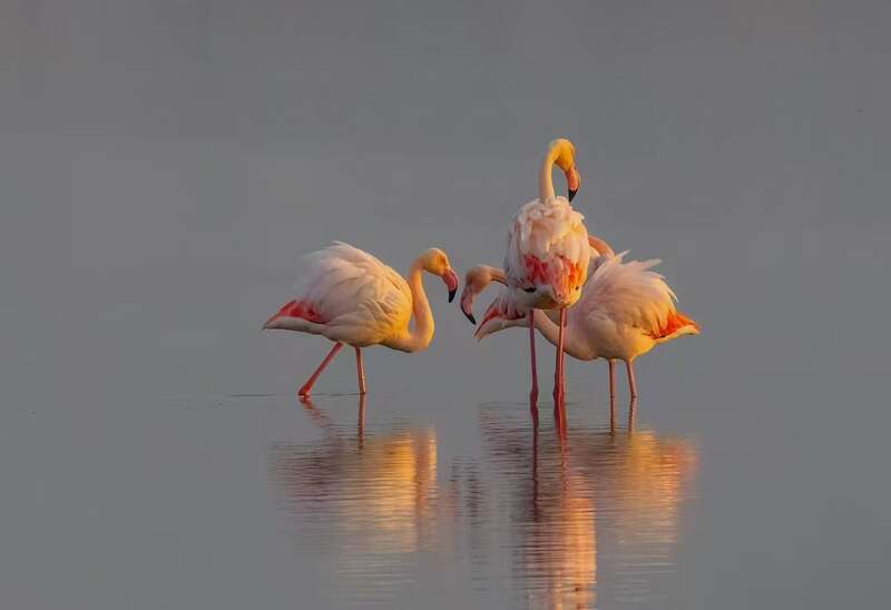 “火烈鸟是国家一级保护动物,十分罕见,它们爱吃咱盐池里的卤水虫,所以年年都会来。”老徐一边给记者科普,一边叮嘱观鸟的“规矩”。语毕,停车。在一片开阔的湖面上,四只羽毛红似晚霞、腿细长如玉簪的火烈鸟正在悠然觅食。早已有一群观鸟爱好者蹲守多时,“大炮”似的长焦镜头比手臂还长。“鸟友”们见新来了人,颔首一笑,又赶忙把视线移回相机。