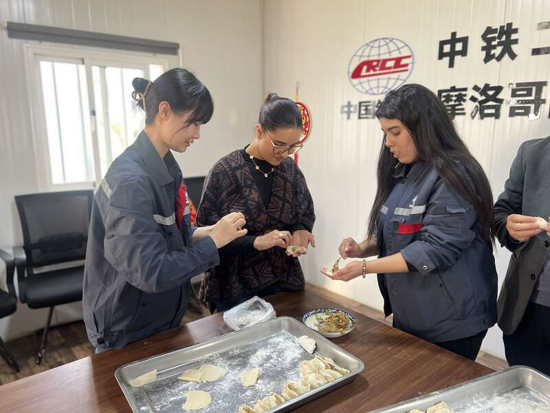项目食堂里,年味最是浓厚。“左手托住皮儿,右手放馅别太多,从边上往中间慢慢捏,劲儿匀一点才好看。”项目办公室主任潘婷一边示范,一边耐心教当地翻译尼阿玛包饺子。面粉沾了手指,馅料偶尔溢出,尼阿玛学得格外认真,包出的饺子虽然形状各异,但每一个都透着“用心”。案板上,一排排饺子整齐排列,中摩青年员工围坐一堂,揉面声、欢笑声交织成海外员工心里最暖的年味儿。