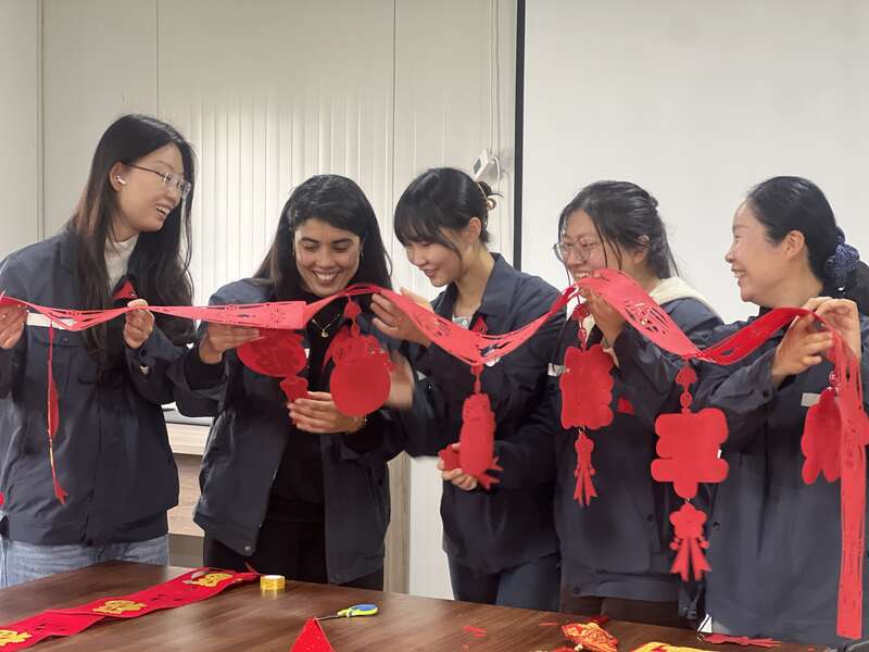 会议室里同样热火朝天。大家搬桌椅、挂彩灯、贴窗花,一边布置春节联欢场地,一边互相打趣说笑。“人虽在海外,春晚必须安排上!”办公室文员宋朝阳拿起窗花,转头笑道:“这些新年装饰的拉花,都是提前一个月从中国超市预订的,就是为了让大家在海外也能感受到正宗的年味。”不仅如此,项目部还特地为大家准备了一份神秘惊喜,为春节期间过生日的同事举办集体生日会,让他们在异国他乡既过好年,也过好生日。