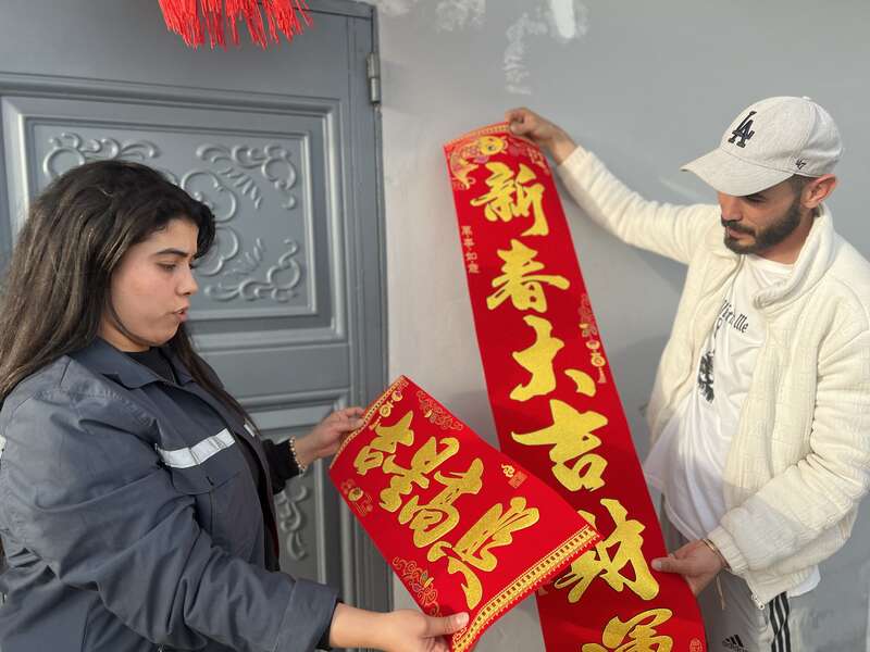 走进项目部驻地,红灯笼一串接一串,大门上的“福”字鲜亮夺目,一副春联格外醒目:丝路架桥连中摩,匠心筑梦通未来。