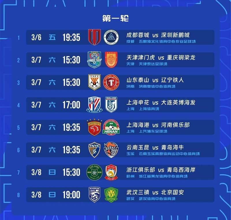 根据赛程安排,2026赛季中超联赛首场比赛将在3月6日19时35分打响,由成都蓉城主场迎战深圳新鹏城。作为本赛季未受处罚的球队,两队均将以0分的“优势”开局。