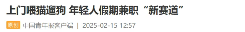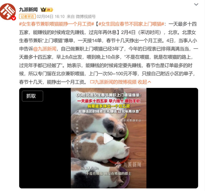 据媒体报道,1991年出生的桓聪是一名宠物行业从业者,已深耕上门喂猫业务9年。他表示,今年春节,叠加节前节后20多天,其团队共完成上门喂猫订单约2000单,其中他独自承担约1000单,与4名员工共同支撑起春节期间上海留守宠物的照料需求。