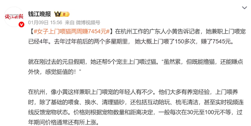 桓聪表示,“今年春节的上门喂猫订单,目前已接到320多家,相比去年的270家,涨幅18%,预计春节结束能达到25%的涨幅,单单上门喂猫的收入,预计就能有16万元。”