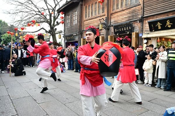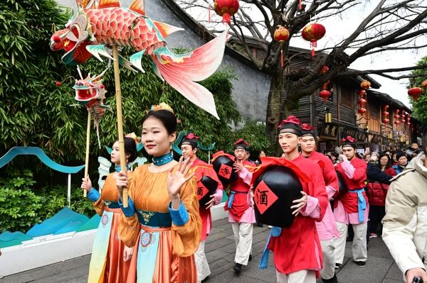 2026年2月19日,福建福州,春节期间,三坊七巷举行“坊巷寻梦·马上有福”非遗主题巡游,闽剧、福州三宝、青红酒、畲族文化、油纸伞、鱼灯与滚灯等非遗项目被转化为多个动态行进方阵,上演了一连串“非遗快闪舞蹈”,为市民和游客带来浓浓的年味和新春祝福。