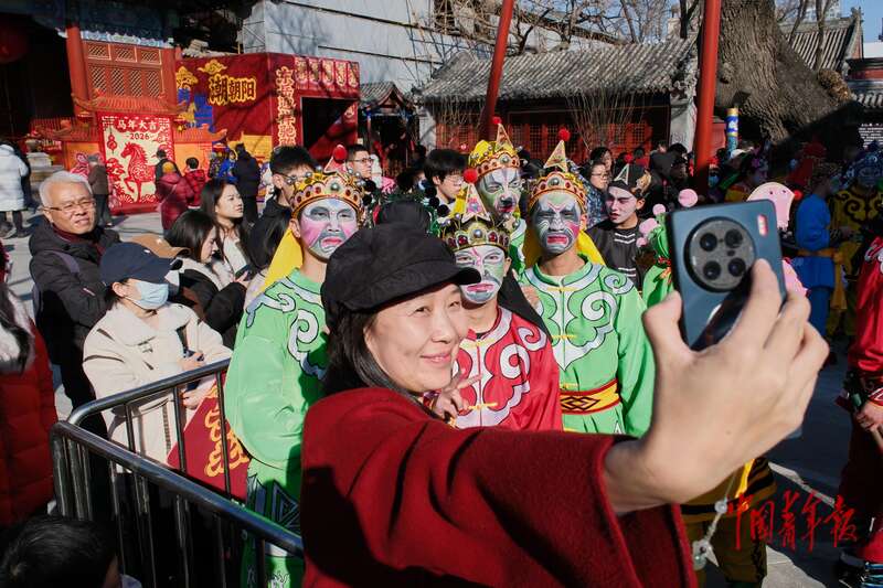 2月18日,北京东岳庙庙会,一名游客在演出后台区域与潮汕英歌舞演员拍照留念。中青报·中青网记者 田嘉硕/摄