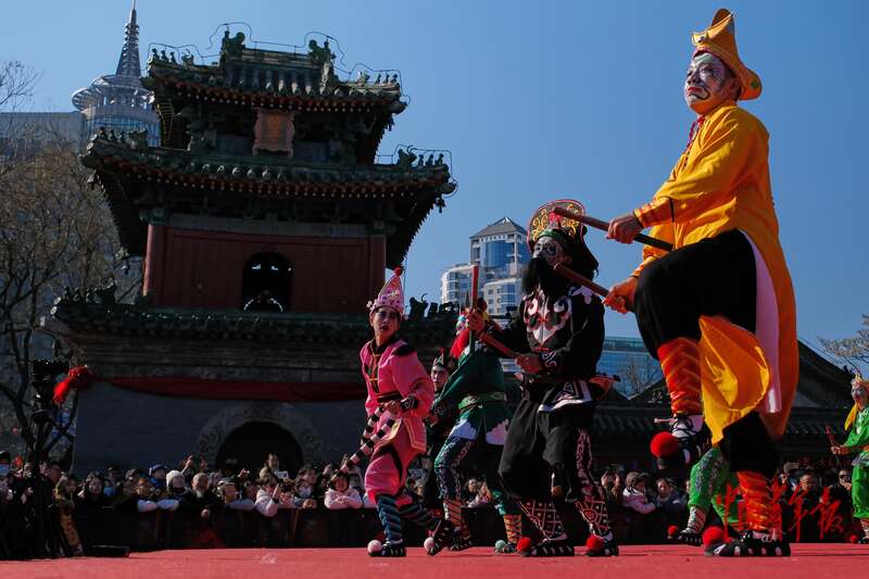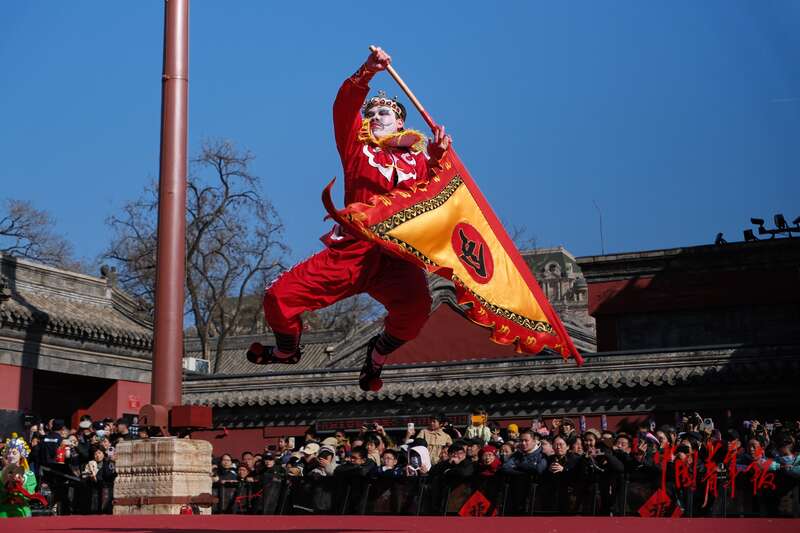 2月18日,北京东岳庙庙会,来自广东潮州的潮響英歌队正在为游客呈现潮汕英歌舞表演。中青报·中青网记者 田嘉硕/摄
