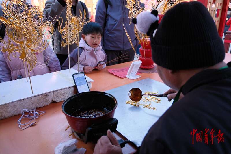 2月18日,北京东岳庙庙会,糖画手艺人正在给小朋友绘制“跃马”糖画。中青报·中青网记者 田嘉硕/摄
