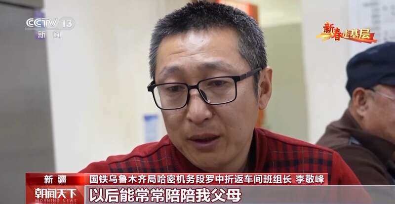 国铁乌鲁木齐局哈密机务段罗中折返车间班组长 李敬峰:做儿女的,不能经常在身边,我的新年愿望就是以后能常常陪陪我父母,能在身边多尽尽孝。爸爸妈妈,今年过年你们一定过得高高兴兴的,我不在身边,你们一定要注意健康,不要想我,我一定把这块工作干好。