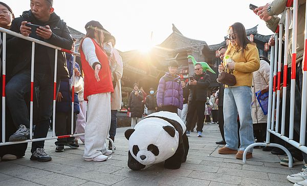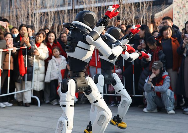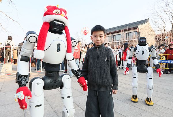 2026年2月18日,江苏省淮安市千年河下古镇景区机器人扮熊猫为游客表演节目。