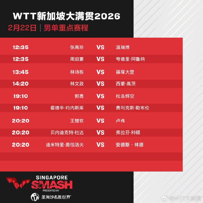 今天(22日),2026年WTT新加坡大满贯正赛打响,首日国乒8人出战,具体赛程如下: