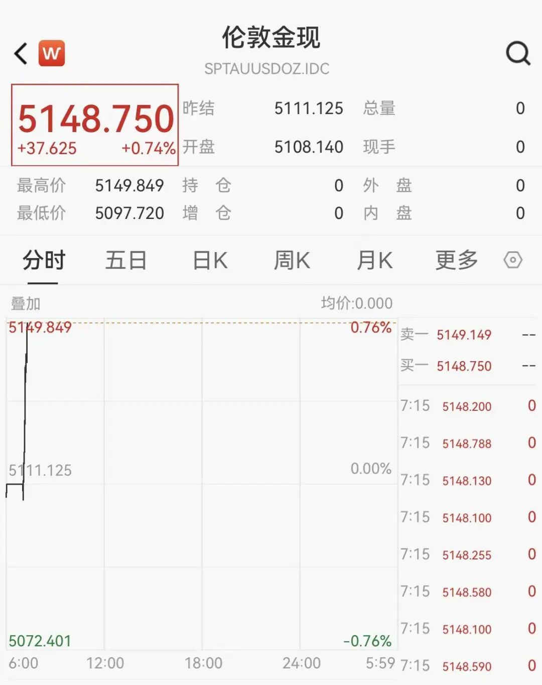 截至7:15,现货黄金报5148.75美元/盎司,日内涨0.74%。