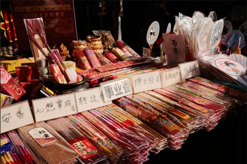 摊位上摆满了 “事业香”“发财香”“转运香” 等祈福香品,还有红包、纸品等物件。密集的货架与暖光交织,映出春节祈福时的烟火气与人们对新岁顺遂的期盼。
