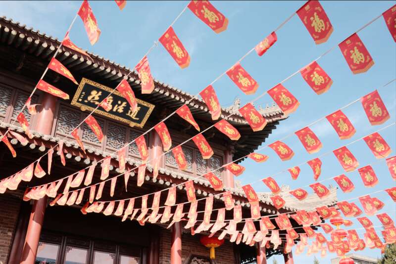 湛蓝晴空下,古建飞檐翘角尽显中式韵味,“道法自然”的匾额庄重古朴。串串印着金色“福”字的红幡凌空舒展,与下方的祈福带交织成红色的海洋。