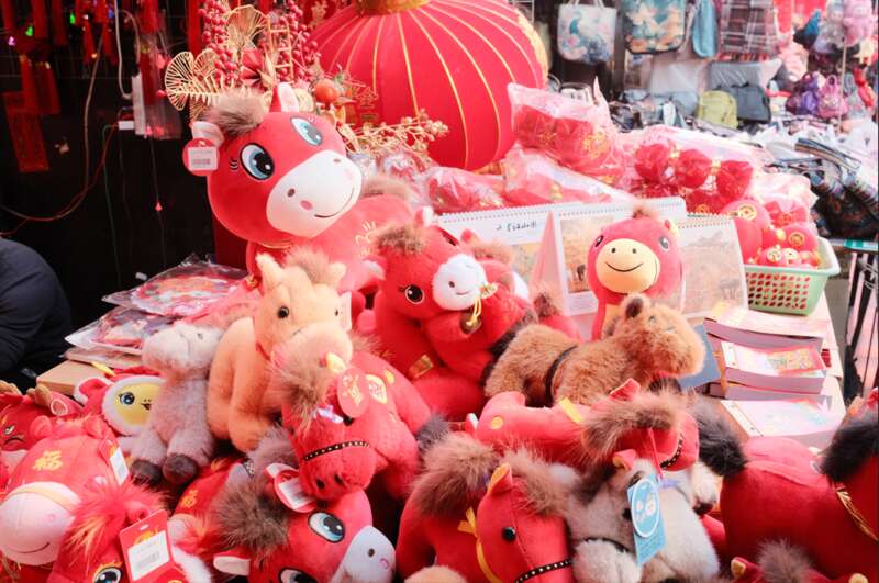 2026马年新春,年货摊位上堆满了各色生肖马玩偶。