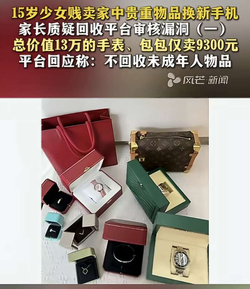 近日,湖南长沙一名15岁女孩为更换新手机,将家中总价值13万元的名牌手表、背包等奢侈品以9300元的价格出售,引发广泛关注。据湖南都市频道风芒新闻2月23日报道,女孩将其中包括一块价值46200元的卡地亚手表以2000元售出,一款价值29500元的迪奥包以1500元出手,一块价值12500元的浪琴手表仅卖得850元。