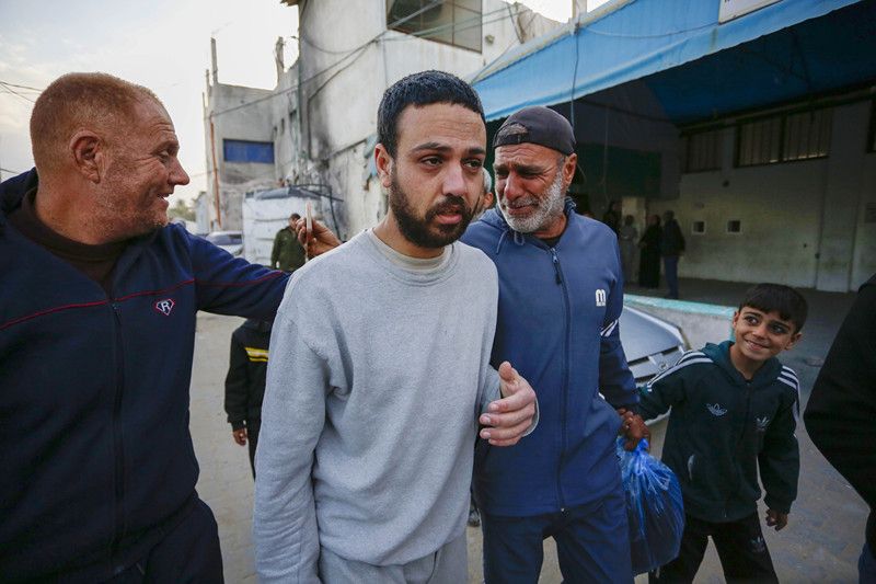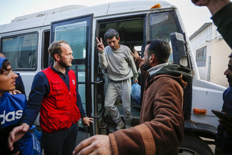 当地时间2026年2月23日,加沙地带代尔拜拉赫,一群被以色列军队释放的巴勒斯坦囚犯经红十字国际委员会被送往阿克萨烈士医院进行体检,并与家人团聚。