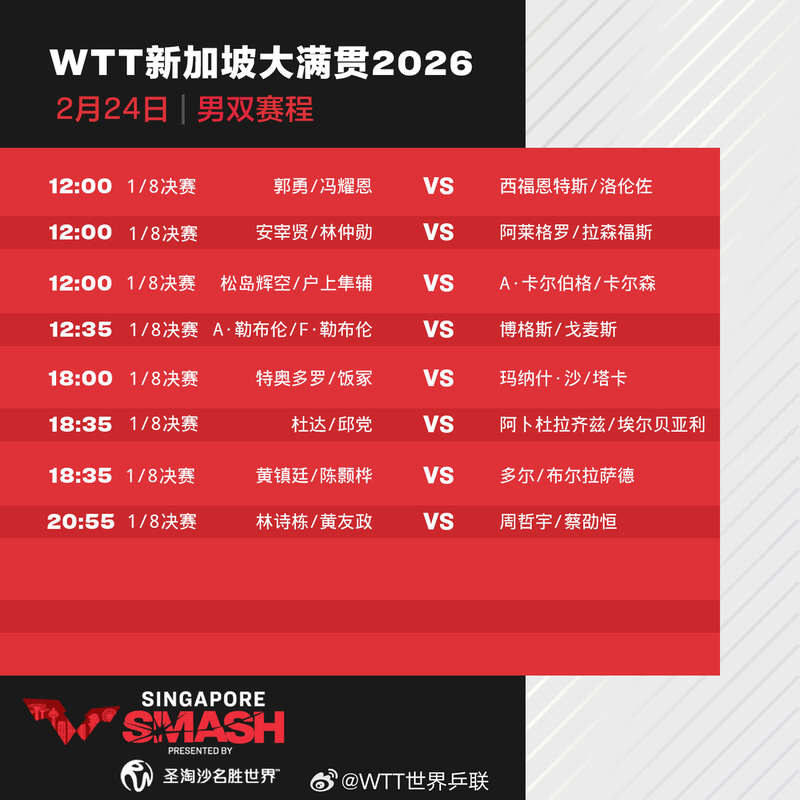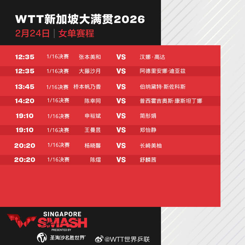 24日,2026年WTT新加坡大满贯进入正赛第三天,林诗栋、王楚钦、王曼昱、蒯曼等出场。具体赛程如下: