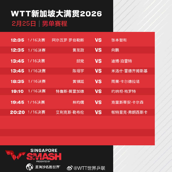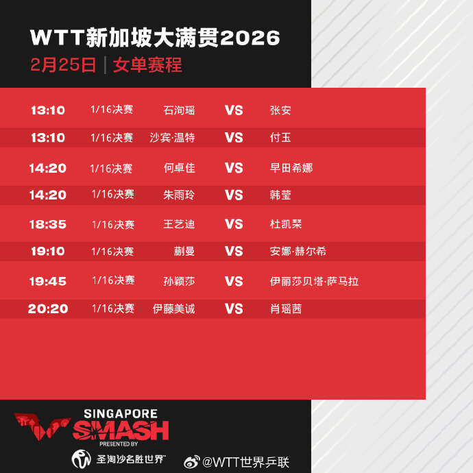 25日,2026年WTT新加坡大满贯进入正赛第四天,孙颖莎、蒯曼、向鹏、陈垣宇等出场。具体赛程如下: