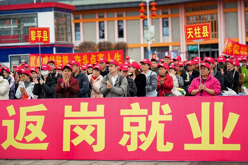 2026年2月24日,在贵广高铁榕江站,务工人员集中候车。