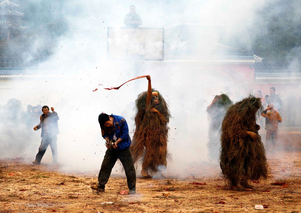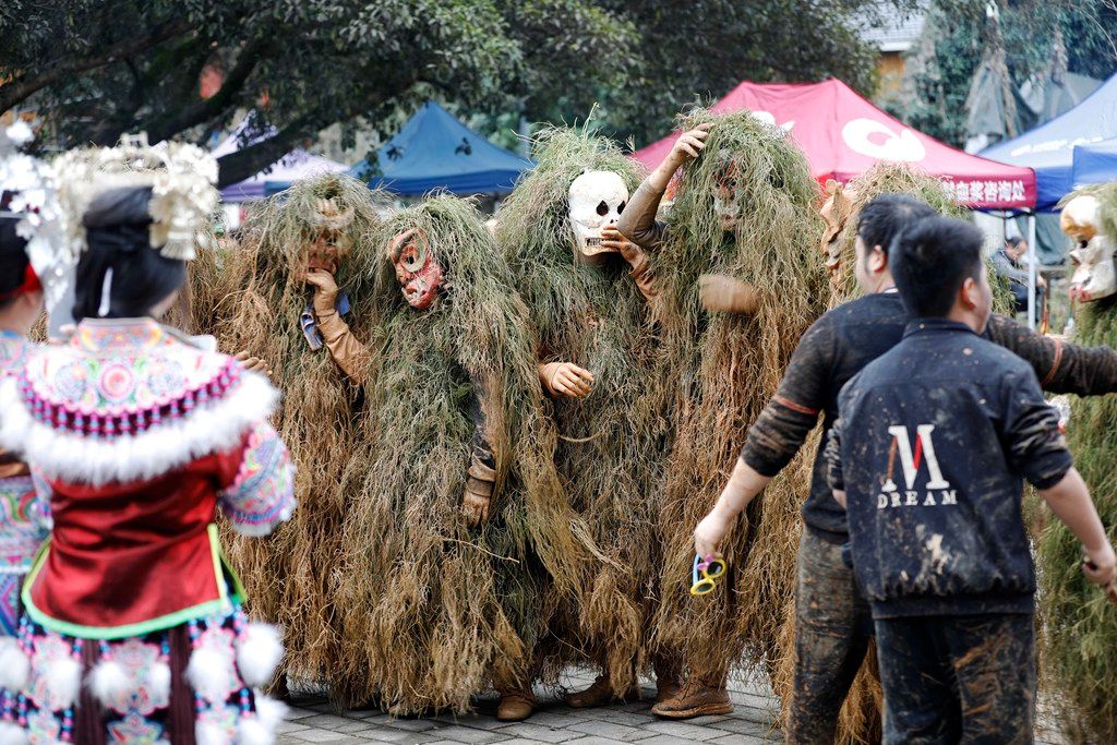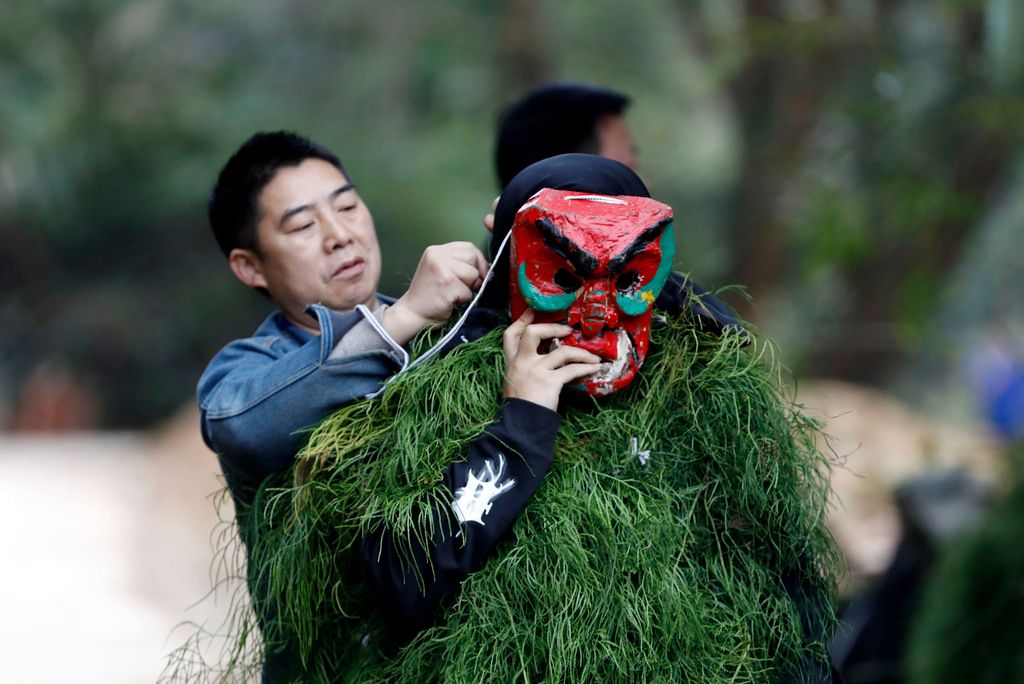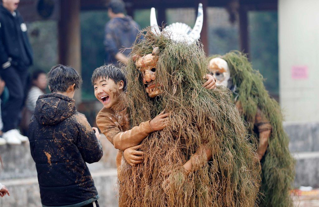 2026年2月25日,广西柳州市融安县长安镇大袍苗寨举行一年一度的“芒蒿”节。十多名青年人头戴芒蒿面具,身披芒草,手脚涂黑进行舞蹈,在锣鼓声中,走村串巷,向人们恭祝新年健康长寿。