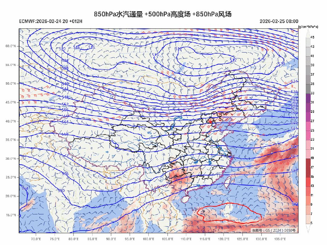 今后几天,暖湿气流(图中红色区域)向北发展。