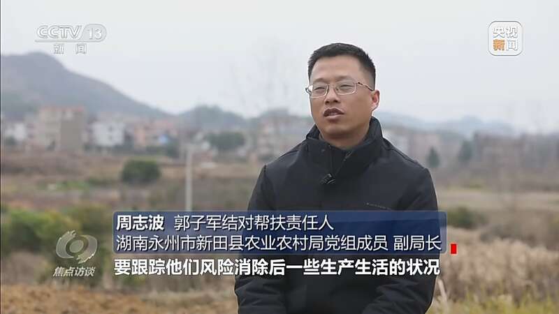 郭子军结对帮扶责任人、湖南永州市新田县农业农村局党组成员、副局长 周志波:要跟踪他们风险消除后一些生产生活的状况,在政策支持这块还要继续因户因人施策,增强他们的收入能力和抗风险能力。