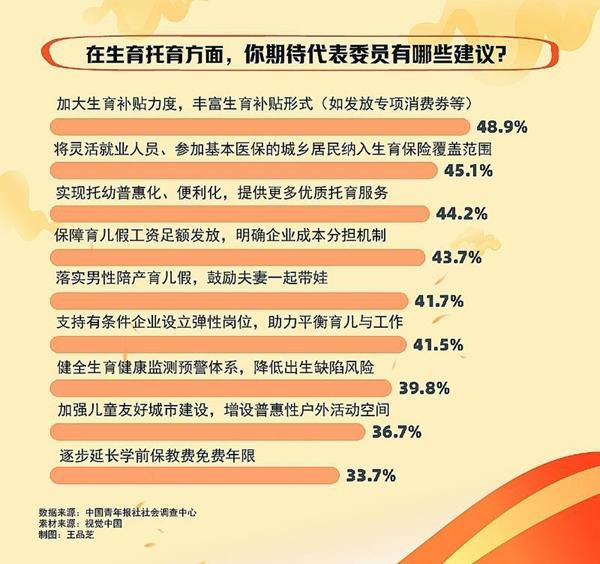调查中,44.2%的受访者期待推动实现托幼普惠化、便利化,提供更多优质托育服务,43.7%的受访者期待保障育儿假工资足额发放,明确企业成本分担机制。