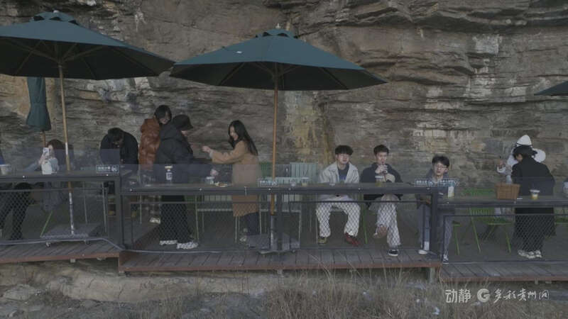 站在悬崖咖啡厅,脚下是150米垂直落差的喀斯特峡谷,建筑与青山融为一体,一杯热咖啡,满眼好风光。即便气温偏低,这里依旧人气满满。