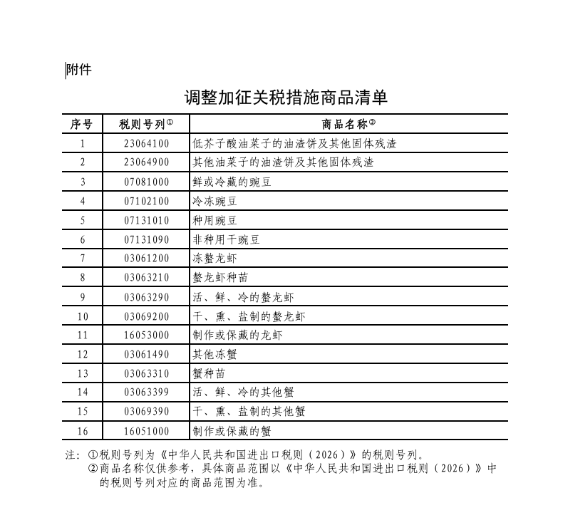 为落实中加两国领导人达成的重要共识,根据《中华人民共和国关税法》、《中华人民共和国海关法》、《中华人民共和国对外贸易法》等法律法规和国际法基本原则,自2026年3月1日至2026年12月31日,调整《国务院关税税则委员会关于对原产于加拿大的部分进口商品加征关税的公告》(税委会公告2025年第3号)规定的加征关税措施,不加征对原产于加拿大的油渣饼、豌豆加征的100%关税以及对原产于加拿大的龙虾、蟹加征的25%关税,具体商品范围见附件。