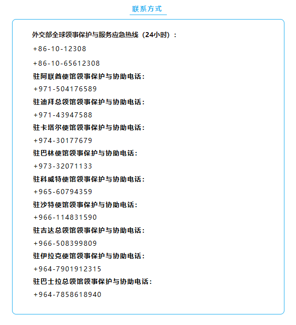 外交部提醒中国公民密切关注形势变化,暂勿前往伊朗周边受到军事冲击的国家和地区。已在上述国家和地区的中国公民进一步加强自身安全防范,避免前往军事设施、游行集会等敏感区域。如遇紧急情况,请及时报警并联系中国驻当地使领馆寻求协助。