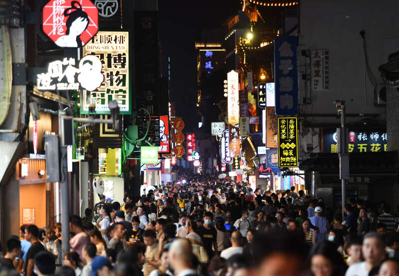 游客在长沙市太平古街休闲游览(2022年7月29日摄)。“十四五”期间,非物质文化遗产、文博IP等消费爆款频现,城市漫步、中式茶饮等成为时尚消费潮流,各地推行各类优惠、补贴,释放消费潜能,激发市场活力。
