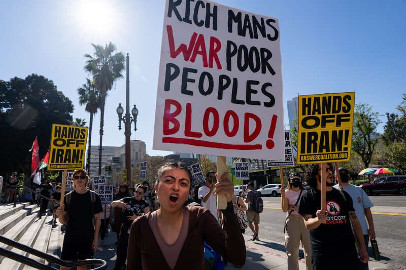 当地时间2月28日,美国洛杉矶,民众在市政厅外举行抗议活动,反对特朗普对伊朗的政策。28日凌晨,美国和以色列对伊朗发动袭击,伊朗随后反击,打击中东多个美国军事基地和以色列目标。视觉中国供图