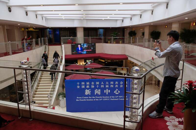 2月27日,北京梅地亚中心,两名记者正在拍摄领取记者证件的Vlog。全国两会新闻中心于当日正式启用。中青报·中青网记者 田嘉硕/摄