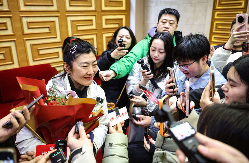 2月25日,辽宁沈阳,中国自由式滑雪空中技巧运动员徐梦桃接受记者采访。徐梦桃与丈夫王心迪在刚刚结束的2026年米兰冬奥会上双双夺得自由式滑雪空中技巧个人项目金牌。视觉中国供图