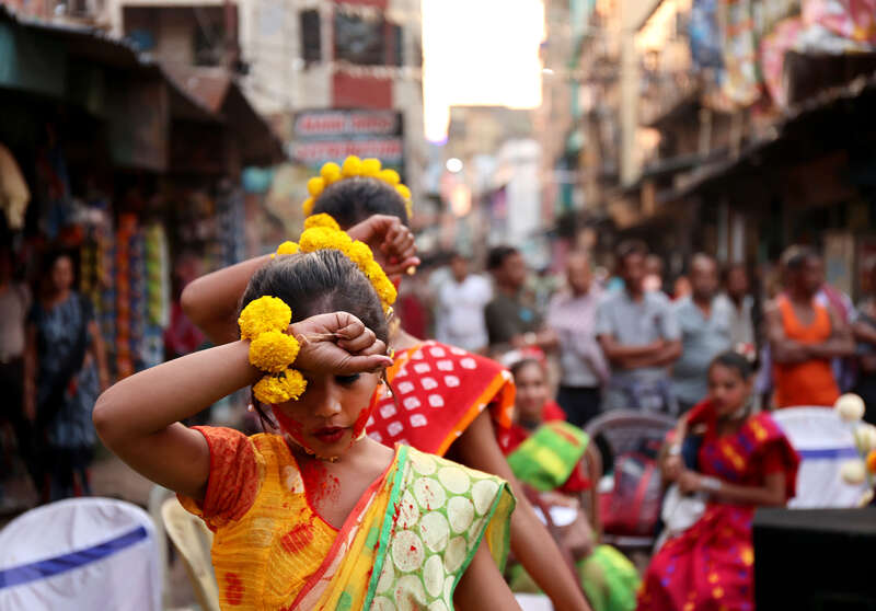当地时间2月27日,印度加尔各答索纳加奇,女孩们在跳舞时涂抹彩色粉末,为洒红节做作准备。洒红节标志着春天的到来,将于3月3日举行。视觉中国供图