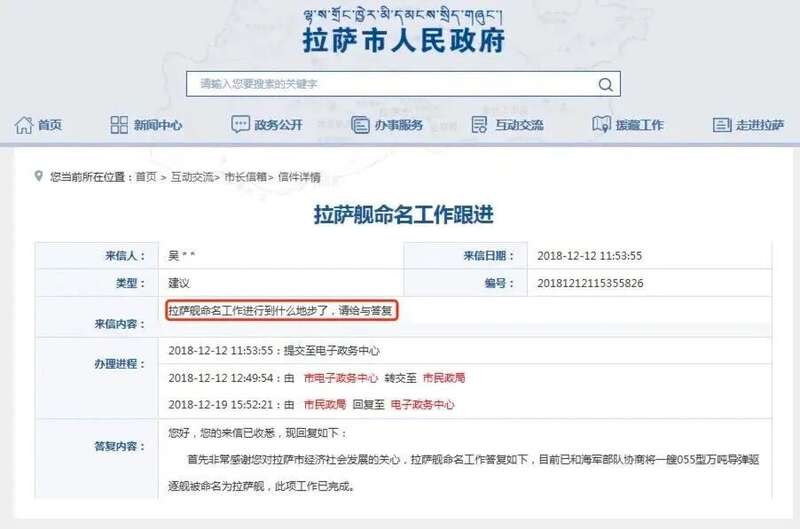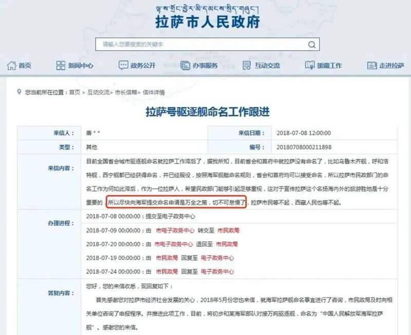 “正在和海军对接万吨驱逐舰命名为‘中国人民解放军海军拉萨舰’”
