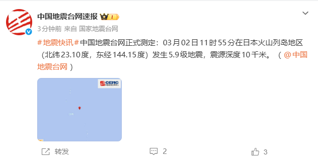 来源:中国地震台网速报微博2026年03月02日